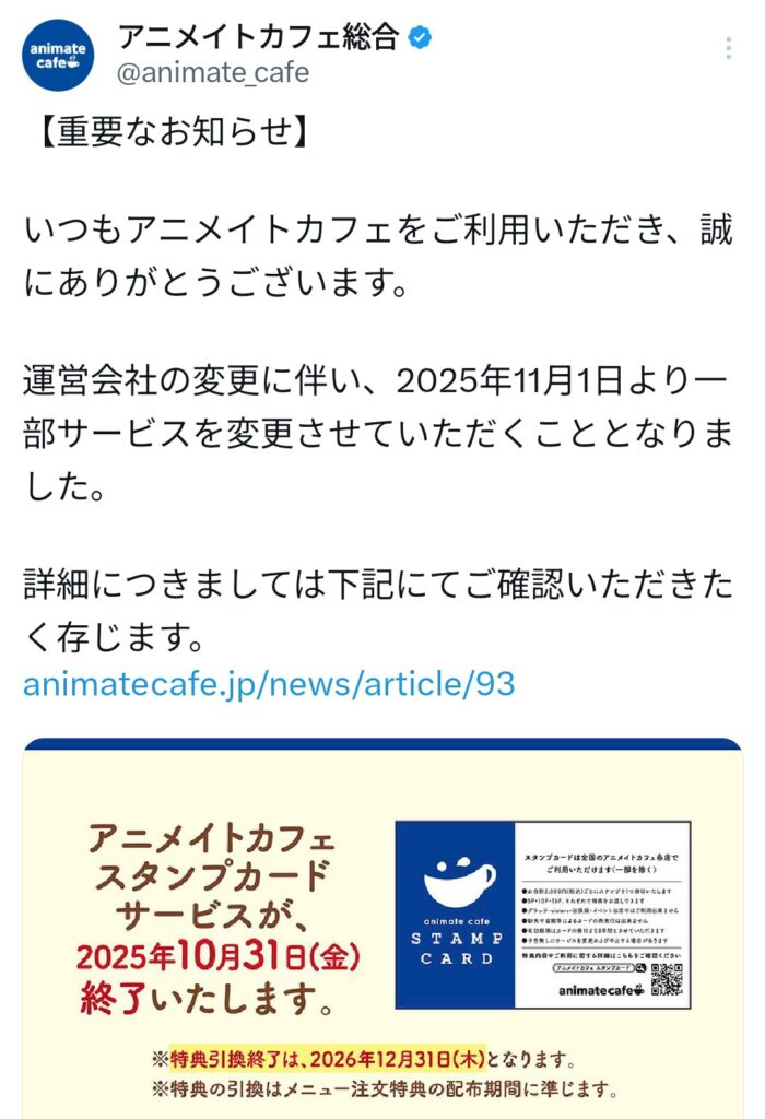 その中のひとつ、アニメイトカフェ総合アカウントから2025年9月30日14:00、このようなお知らせが。