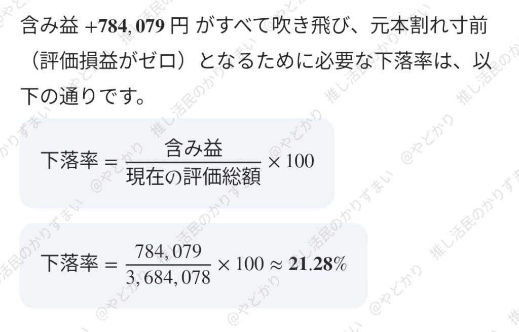 結論として、現在の含み益がすべて吹き飛ぶためには、評価総額から約 21.28% の下落が必要となります。