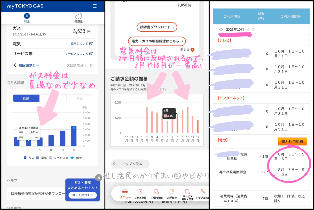 (電気代は電気会社の利用月とクレカ請求月が同じですが、電気会社に表示されている時点で2ヶ月前の数字となっています。)