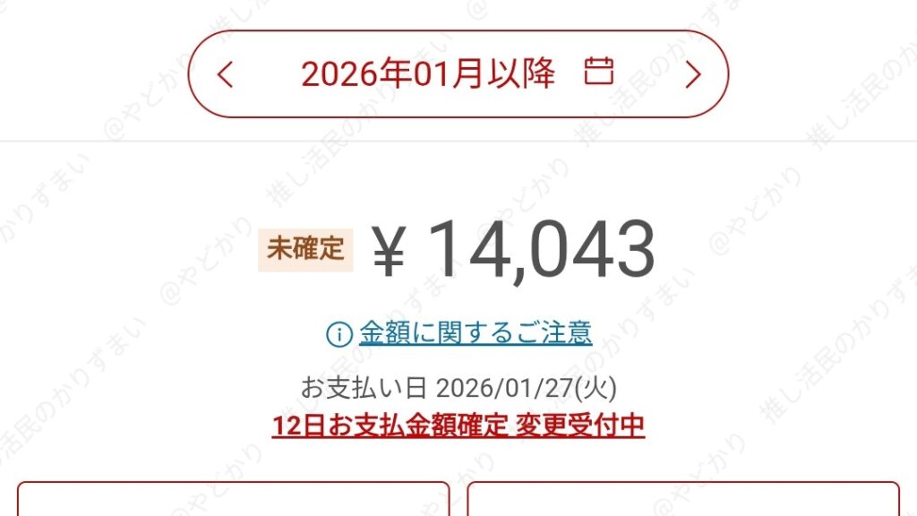 また、12月利用分(1月支払い分)にもAmazonブラックフライデーセールの名残がありましたが、支払金額は14,043円でした。