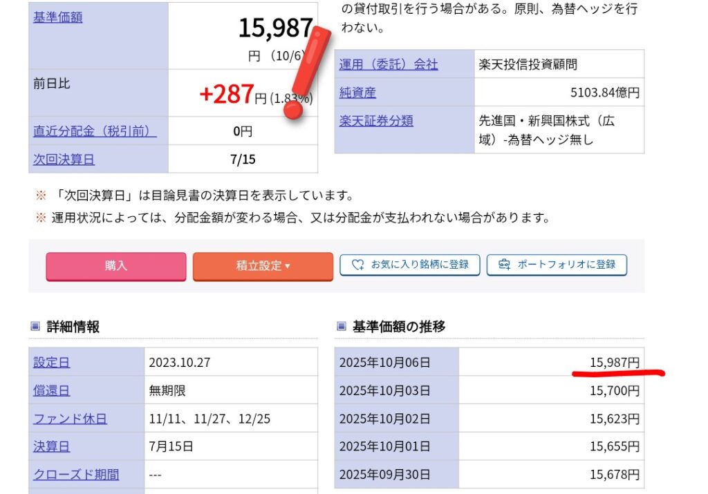 我らが楽天・プラス・オールカントリー、通称楽天オルカンも、10月6日の評価額でこのお祭り騒ぎを醸し出していました。