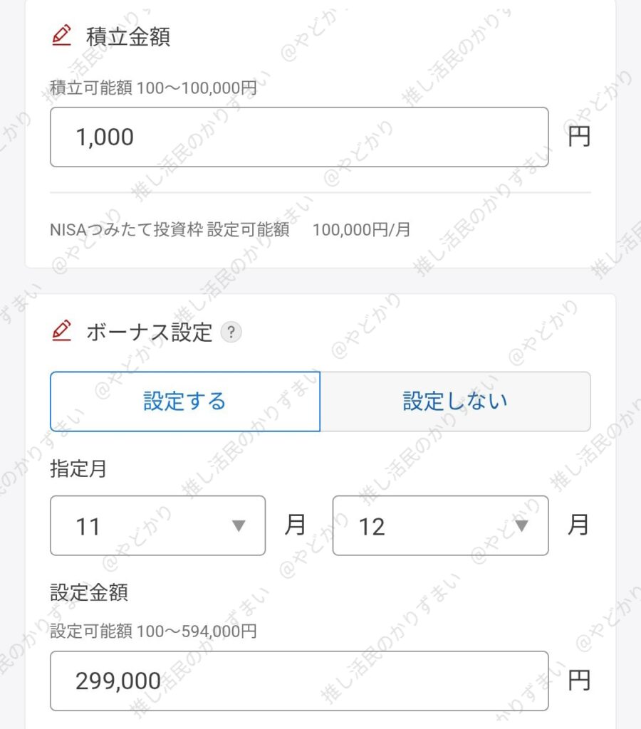 積立設定を1000円に設定してから試してみると、年間投資額を超えるようなボーナス設定をしても普通に通ってしまったのです。