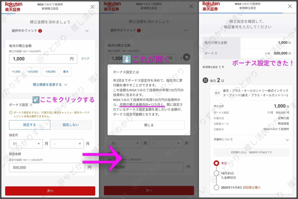 ともあれ、月10万円積立設定をしている民が楽天証券でボーナス設定を利用するために必要な手順はこちらです。