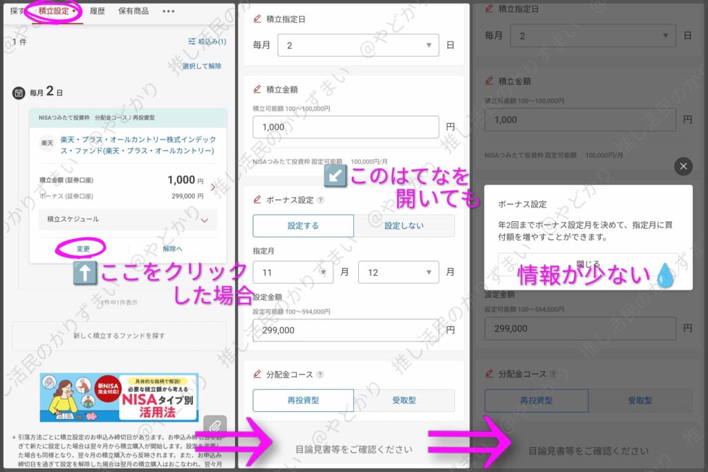 “変更”ボタンから積立設定画面に入ったときに出てくるボーナス設定のはてなマークは、これだけしか情報をくれません。