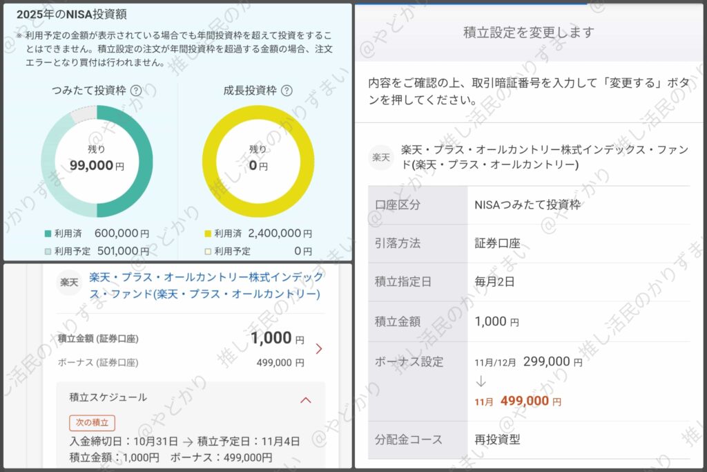 ・ ボーナス設定をひとつ残すことで、積立設定の締切を逃しても、証券口座引落しでボーナス設定をすることにより枠消化を可能にする。