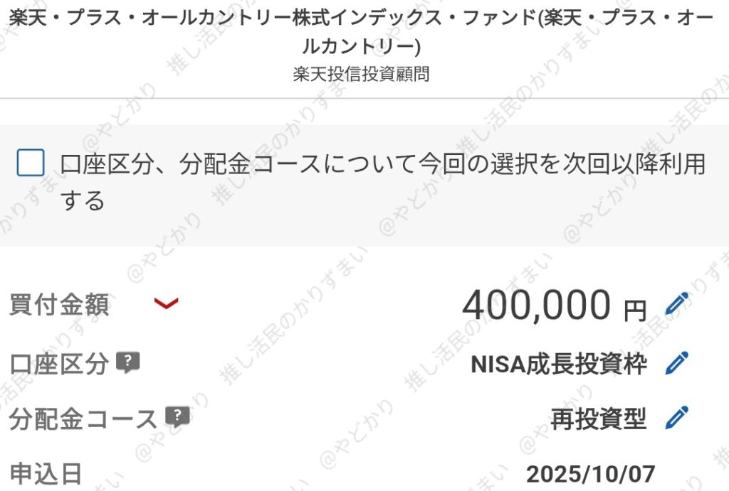 投資信託の画面から楽天オルカンを選択し、成長投資枠で買付金額“40万”と入力。