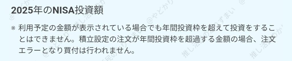 繰り返しとなりますが、NISA利用履歴の画面には、“積立設定の注文が年間投資額を超過する金額の場合、注文エラーとなり買付は行われません。”と書かれています。